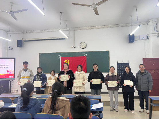 活动开始全体起立奏唱国歌《义勇军进行曲》,全体成员声音洪亮、精神饱满,接着由冷翔老师宣读第三十期入党积极分子培训班结业名单和优秀表彰的决定,并由弋兵书记给优秀学员、优秀组织者及优秀小组颁奖。下一项为优秀毕业学生代表邓茜竹发言,她表示自己今后将不断加强政治理论学习,提高思想道德修养,争取早日成为一名光荣的共产党员。最后一项是弋兵书记作结业总结讲话并宣布培训班正式结业,他首先对同学们顺利完成党课及考试表示祝贺,希望同学们能将所学知识应用到今后的学习、生活和工作中,用理论指导实践,在实践中升华认识,不断开拓创新,积极进取。