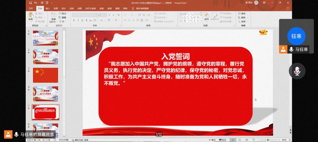 本次党日活动围绕七项展开。第一项,全体起立,奏唱国歌《义勇军进行曲》;第二项全体党员温习入党誓词;第三项,由马钰寒带领大家学习并诵读《中国共产党章程》,提升大家对党的认识,增强政治信仰;第四项,由程冬月同志发表自己学习《习近平总书记在中国共产党第二十次全国代表大会上的报告》的心得体会,提到当代青年党员应在国家建设中拼尽全力,争做国家建设的中流砥柱;第五项,李健飞同志为大家讲党课,提到要牢牢把握学习重点,重点学习党的二十大提出的新章程,抓住新章程中的新重点,推进文化自信自强,广泛践行社会主义核心价值观,发展文化事业和文化产业,进一步增强文化的传播力度;第六项,各支部交流发言,赵伟、王玥迪和唐子怡三名同志依次发言,发言中提到全体党员干部要想实现全面建设社会主义现代化国家,弘扬伟大建党精神,就要全面贯彻落实党的二十大精神,在今后要把党的二十大精神贯彻落实到国家工作中。第七项,各支部围绕“学习贯彻党的二十大精神,奋力冲刺全年目标任务”进行讨论。